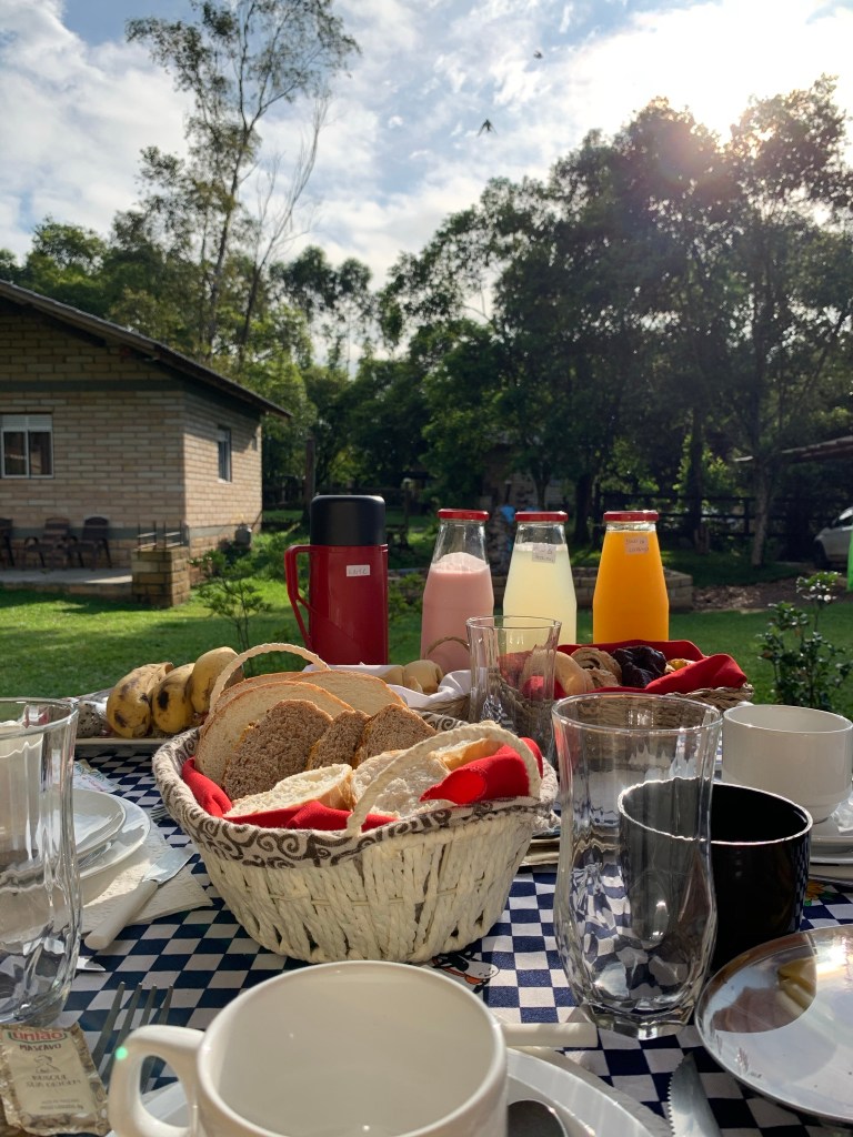 Pousada Equilíbrio dos Canyons. Chalés individuais com cozinha e o café da manhã servido na hora que você quiser, em mesas na parte de fora, embaixo das árvores. Que jeito de começar bem o dia!